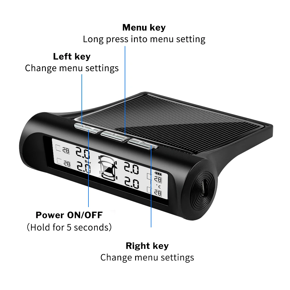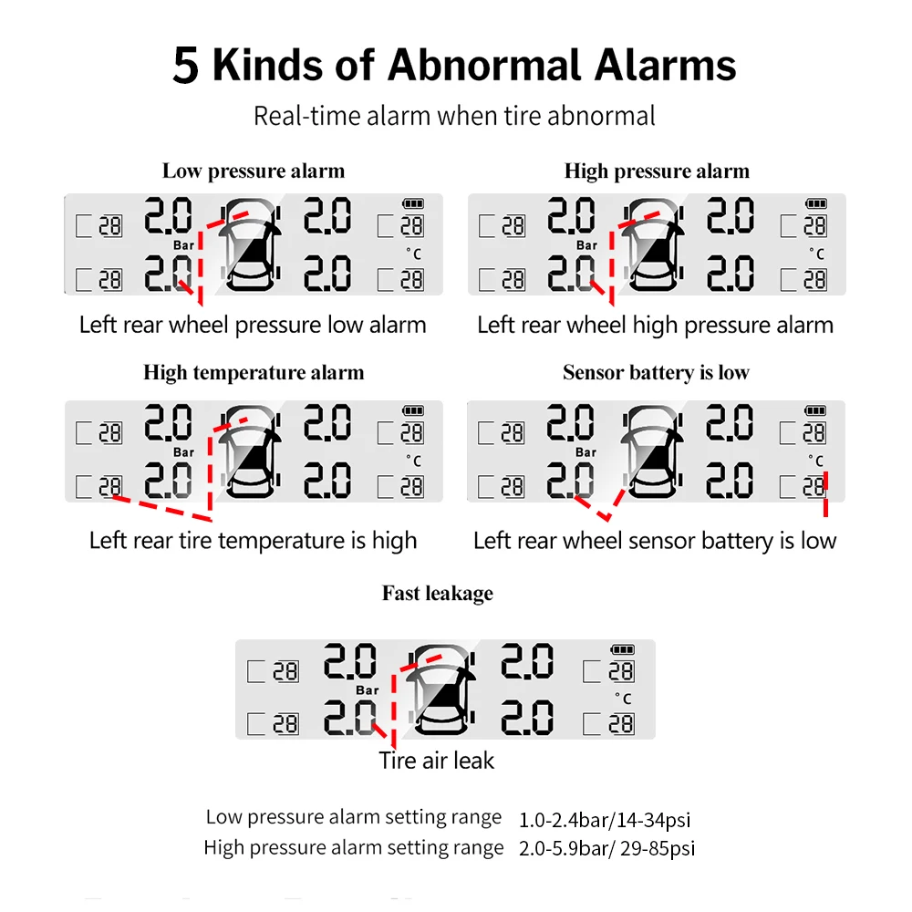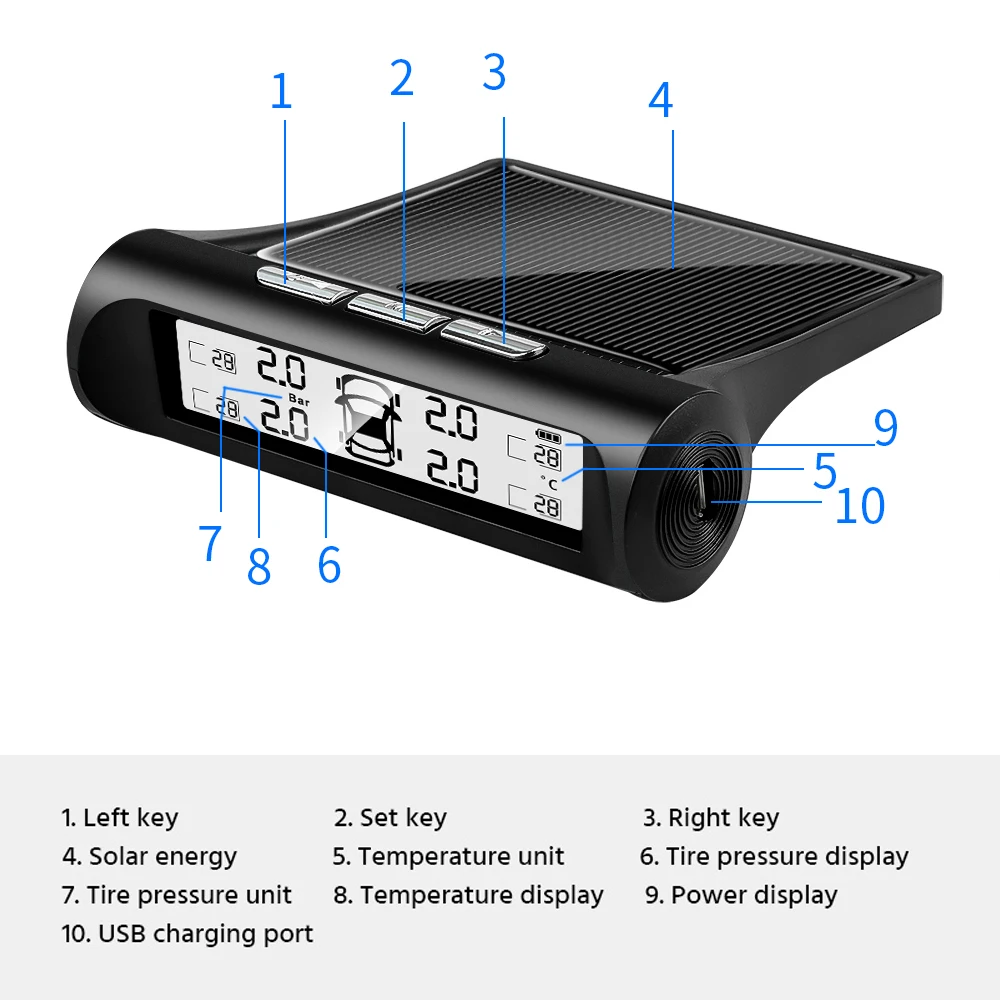Especificações e funções: -Carregamento de energia solar, não precisa cobrar conectando o isqueiro do carro -Colorido LCD Digital exibindo, claro para mostrar informações pneu -Tempo traseiro monitoramento de pressão e temperatura de 4 pneus -Baixa pressão do ar/alarme alta temperatura -Alta temperatura/vazamento/bateria baixa alarme -Bota de choque inteligente quando o carro se move, não precisa ligar/desligar -Wireless conectar por sensores, fácil instalar -Sensores de chip Freescale e cabem em quase 98% carros no mercado